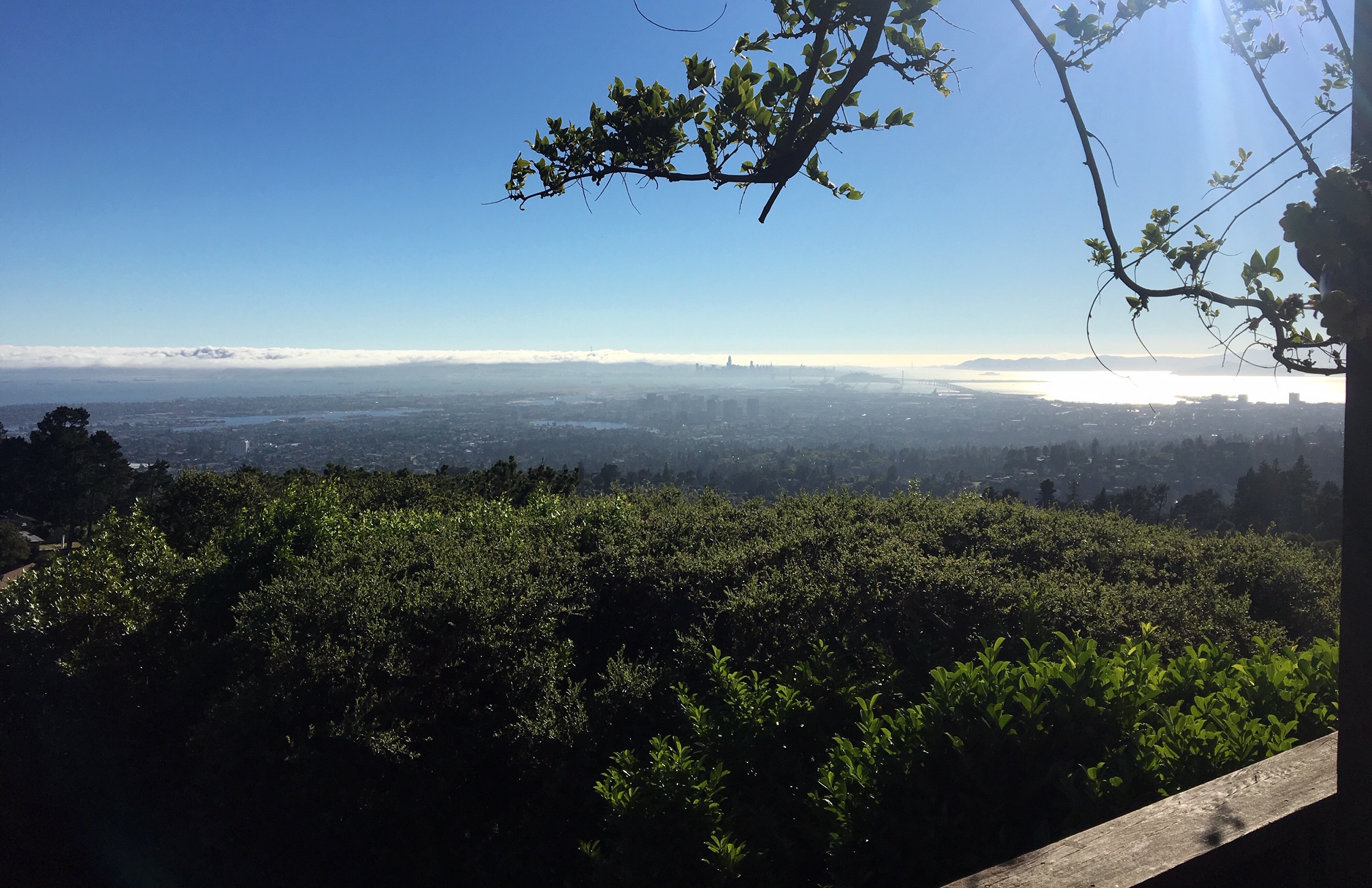 No photo could really do justice to the view from Chez Potts, least of all one of mine (with the sun shining straight into my lens), but here’s a pathetic, lisping attempt, at several removes from Reality, intended to capture the westward view of Oakland and San Francisco from the hills east of there. Photographic trade-off: either take a picture looking straight into the sun, or wait for the sun to go down and for the fog to set in. Plato would have understood.