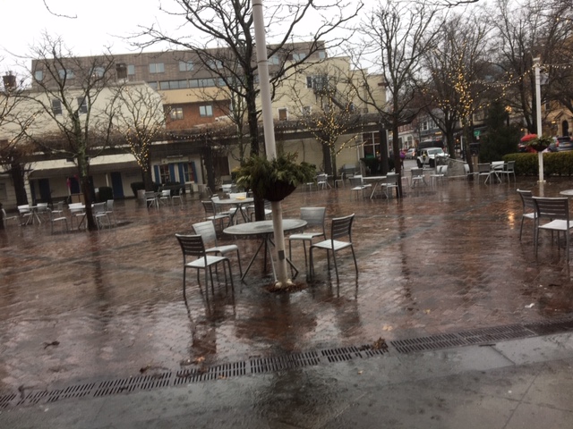 It was, to be sure, a chilly day with a pouring rain. So I drove down to Princeton, parked my car, walked over to Hinds Plaza, and encountered this scene…