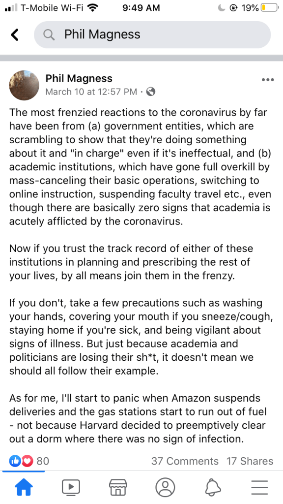 Why would a historian, of all people, delete such a post (below the fold) from his Facebook timeline?* Isn’t it an important part of the historical record worth preserving? And I’m curious: has the time come to close the universities yet? Or should they have been kept open this whole time? To the end of the semester, maybe? Into summer session?