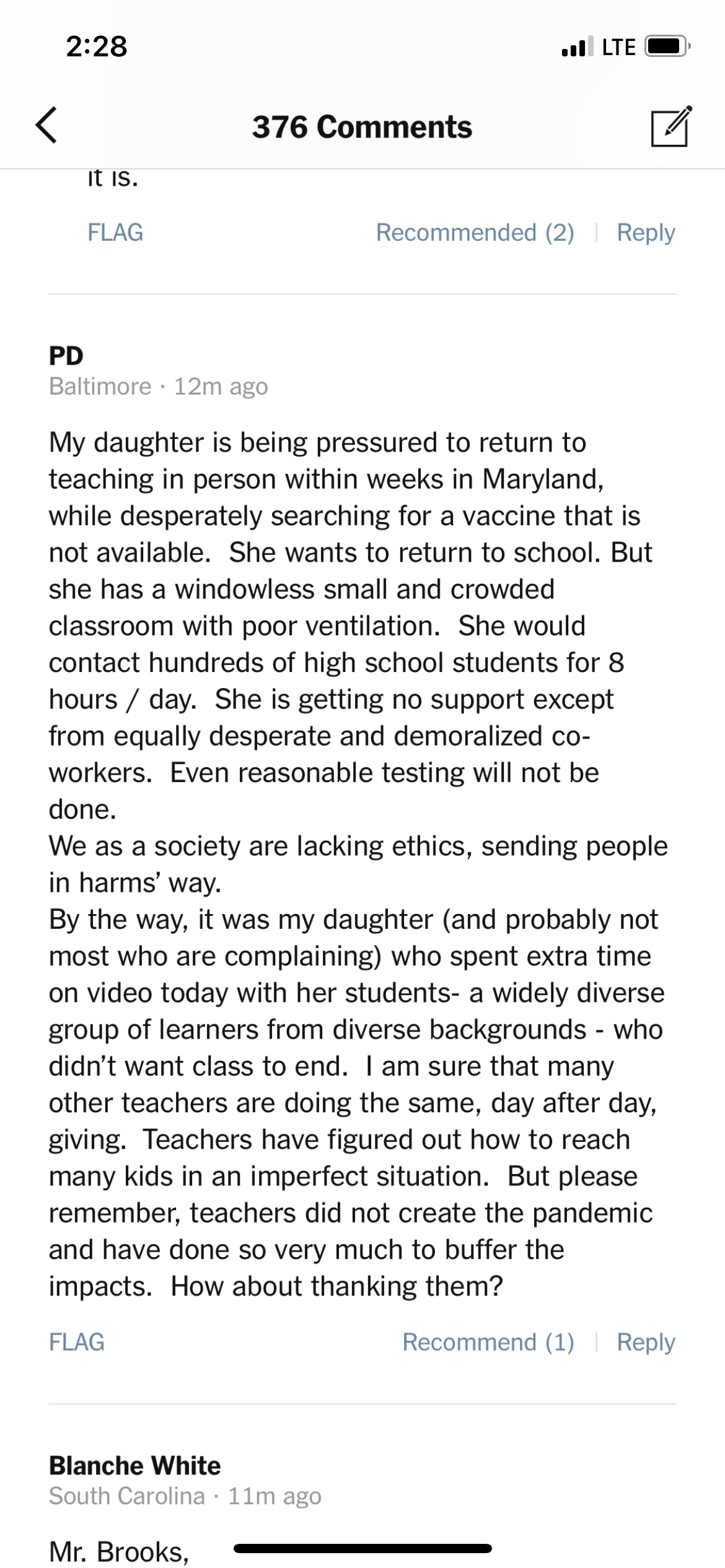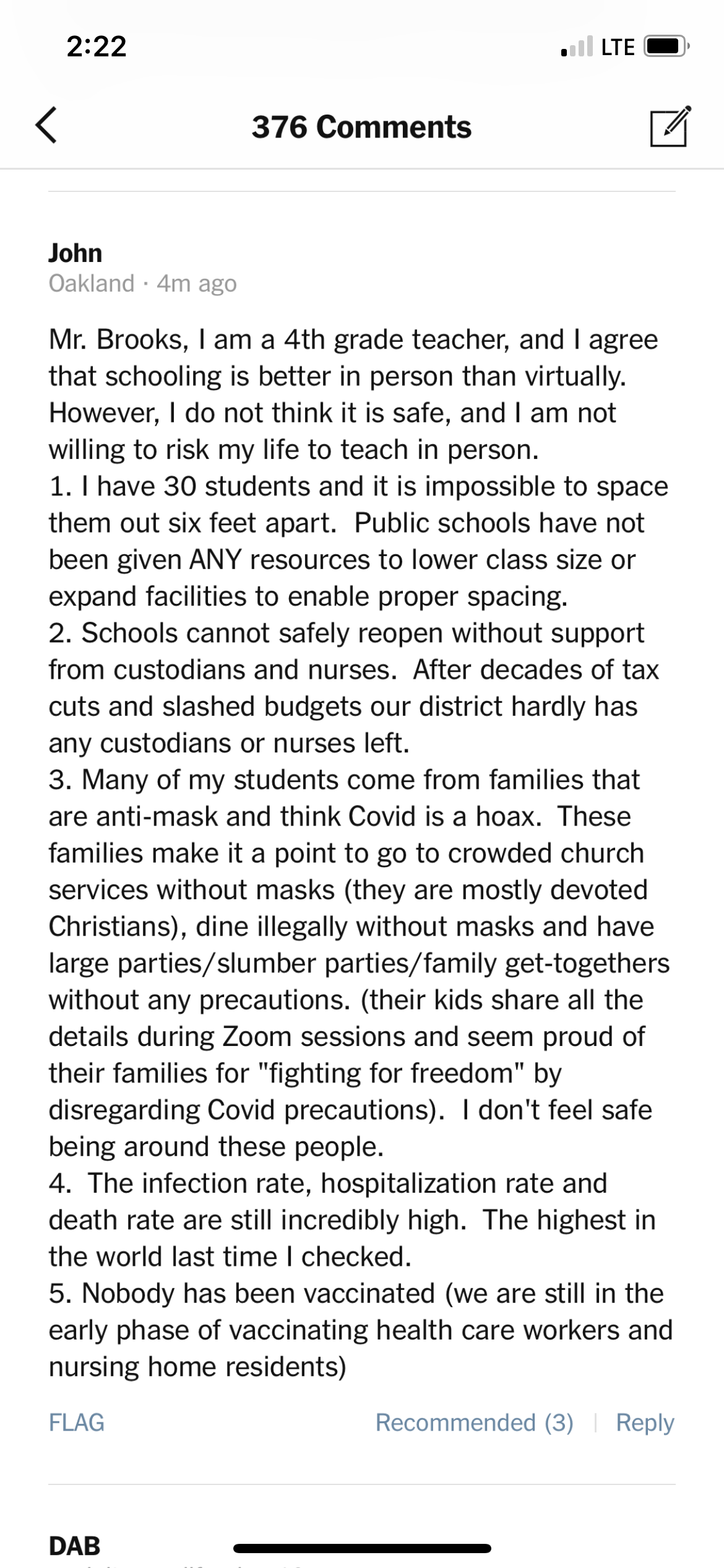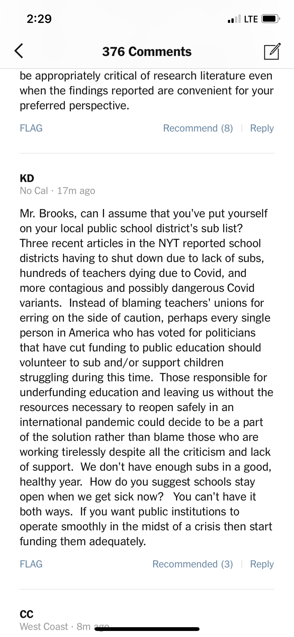 People sometimes like to brag on social media that they “don’t read the comments.” I like to brag that I do. In this post, I’ve posted nearly a dozen screenshots of comments by ordinary commenters at The New York Times website, demolishing David Brooks’s ignorant, self-righteous, shaming defense of in-person teaching in K-12 public schools.