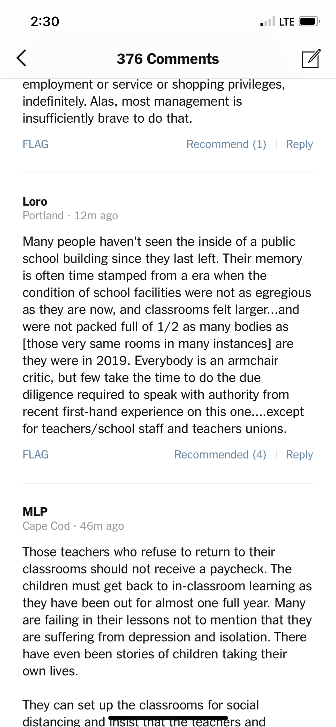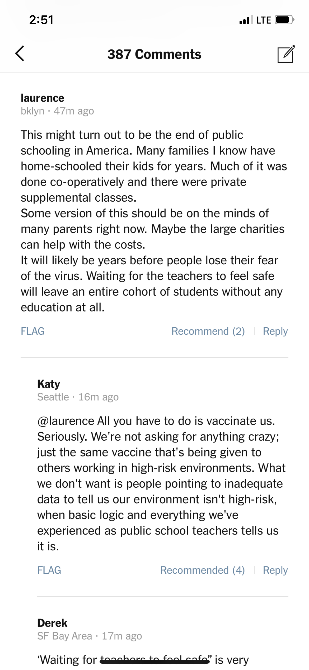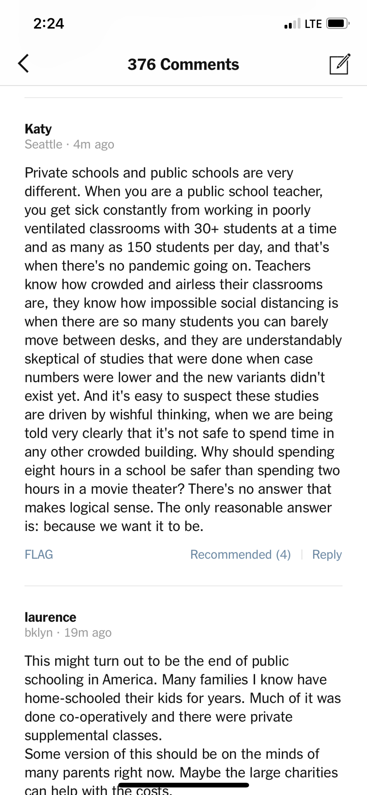 People sometimes like to brag on social media that they “don’t read the comments.” I like to brag that I do. In this post, I’ve posted nearly a dozen screenshots of comments by ordinary commenters at The New York Times website, demolishing David Brooks’s ignorant, self-righteous, shaming defense of in-person teaching in K-12 public schools.