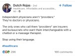 Nazi card or not, these claims are nonsensical. Newsflash: Physicians are health care providers, just as professors are educators, or janitors are cleaners, or people who work primarily with their hands are laborers. There’s nothing to dispute here, just time and energy to be frittered away on a quixotic semantic battle masquerading as a noble crusade. They should be grateful that no one is calling them “consultants.”
