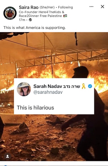 I live in a Jewish household. When I played the clip of “Death to the IDF” to the resident Jew around here, she smiled. If the IDF thinks it’s won this war, its members should remember that smile. It says, loud and clear: Jews want you dead, too. If the IDF considers that response from that source compatible with victory, maybe that’s because its indiscriminate war against Palestinians is also a discriminate one against Jews.