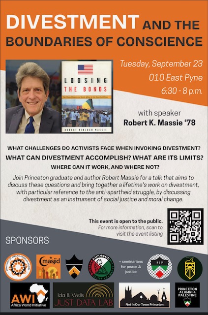 It was about a year ago that I got it into my head to get Robert K. Massie IV involved in our efforts. Massie is one of the architects and chroniclers of the decades-long campaign to divest from apartheid South Africa; I’d first encountered his book Loosing the Bonds twenty years ago, and been impressed by the rigor of his argument, as well as by the wealth of detail and moral passion he brought to the subject.