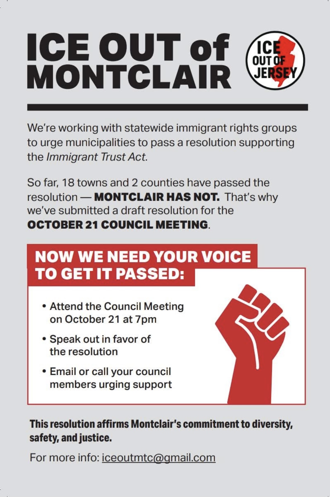 - Also tonight, a group of activists is speaking in favor of a pro-ITA resolution at the Town Councils of both Montclair and Highland Park (ICE Out of Montclair and DIRE, respectively).