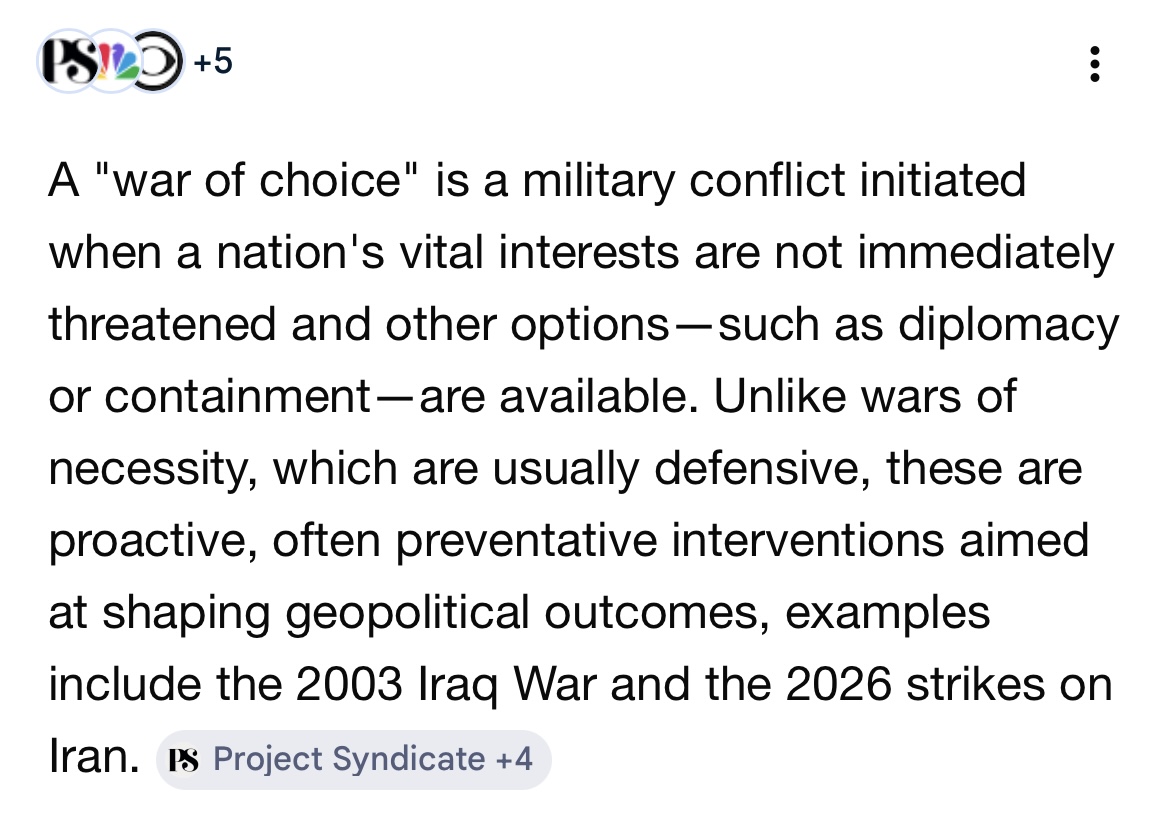 It’s worth asking, in this context, what the phrase “war of choice” really means, and why this rather odd neologistic phrase has become so current. An AI query on the phrase yields the following.
