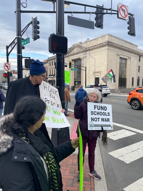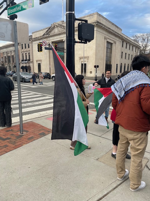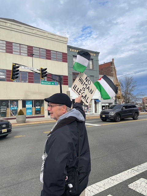 We got several dozen commendatory honks from passing cars at Church Plaza in Montclair the other night, but there were at best a dozen or so of us protesting at any given time. As far as pedestrians were concerned, we got maybe two or three hecklers, and a dozen half-hearted expressions of interest from passing pedestrians, but were mostly met with polite indifference. It was Friday evening, and people were out and about to have a good time downtown. The war was further from most peoples’ minds than dinner or dessert, so no one on Bloomfield Avenue was about to be detained by a bunch of activists waving anti-war signs or Palestinian flags.