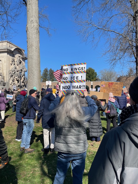 My discussion here has admittedly severe experiential limits. I work long hours, have a long commute, spend a fair bit of time reading and writing rather than agitating, am an introvert, and have a strong aversion to being arrested or fired. So I’m a sunshine activist at best, a dilettante rather than a disciplined social justice warrior of any kind. Over the last month, I attended five demonstrations in two towns–four anti-war demonstrations and one No Kings rally. Two of the anti-war demonstrations were student-organized events at Princeton University; the other two were organized by off-campus anti-war groups, one by the Coalition for Peace Action in Princeton, the other by New Jersey Peace Action in Montclair. On Saturday morning I went to the No Kings rally at Monument Park in Princeton, the first No Kings event (I think) that I’ve so far attended.