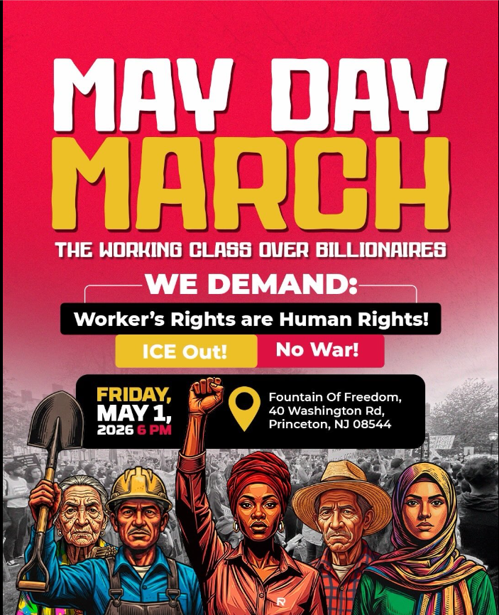 May Day March Posted on April 18, 2026 by Irfan Khawaja under activism, General announcements, migrant defense, Notes on the Anti-War Movement, Palestine, War with Iran Sponsored by Resistencia en Acción, Princeton, New Jersey Share this: Email a link to a friend (Opens in new window) Email Share on X (Opens in new window) X Share on Facebook (Opens in new window) Facebook Share on LinkedIn (Opens in new window) LinkedIn Like Loading... Related