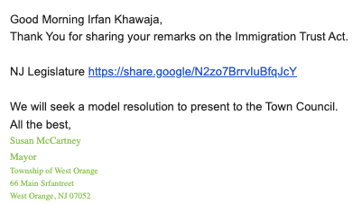 Hi, my name is Irfan Khawaja. I’m here to speak in support of your passing a resolution in favor of the Immigrant Trust Act. I know that West Orange has previously discussed and rejected a resolution, but I don’t find your reasons convincing. Continue reading