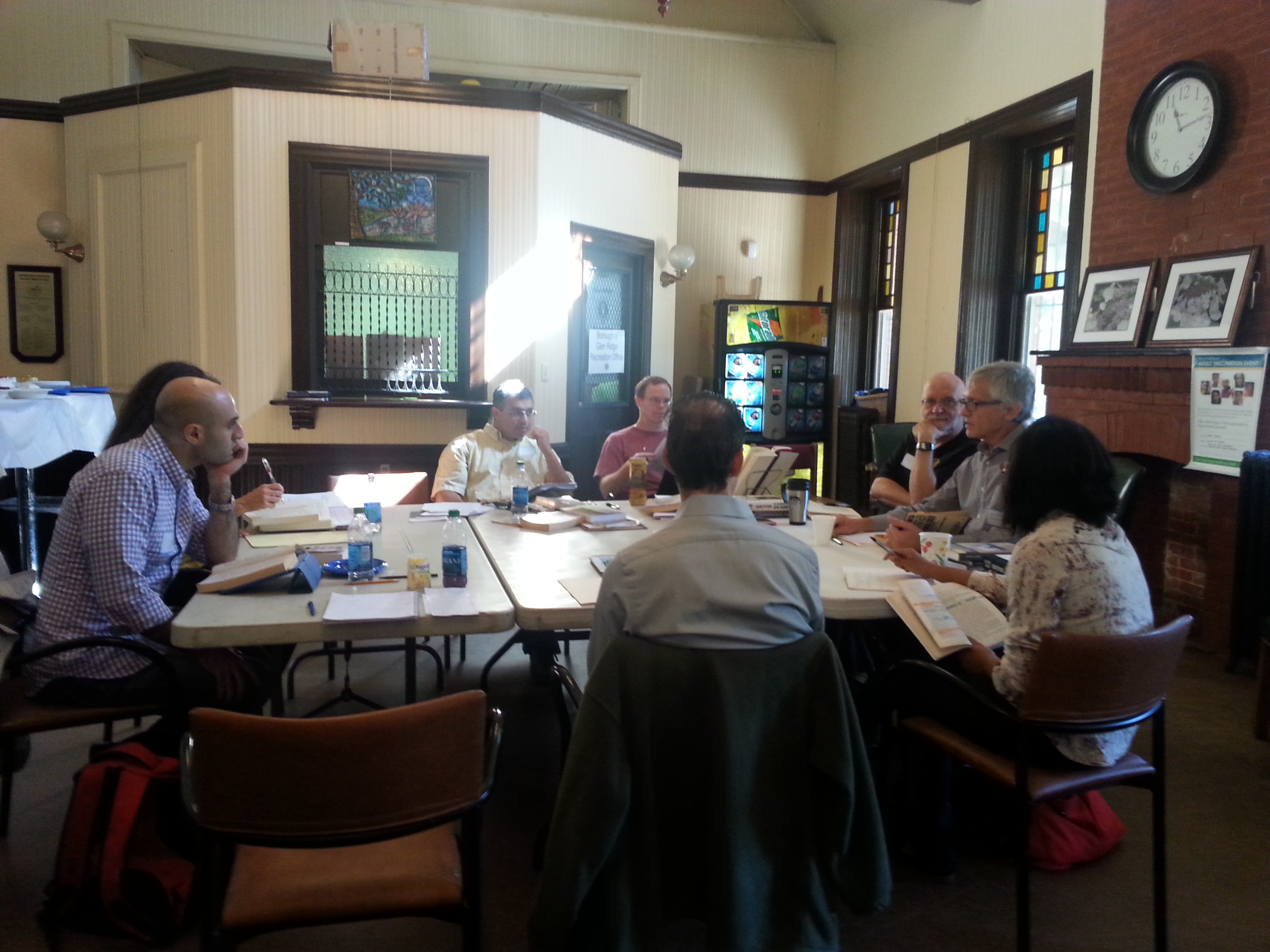 The 2013 Seminar on Concepts, Glen Ridge, NJ (left to right): Ray Raad, Carrie-Ann Biondi (obscured), Irfan Khawaja, Michael Young, Fred Seddon, Stephen Boydstun, Marissa Coronado, Jay Friedenberg. Not pictured: Kate Herrick, Michael DeFilippo. Photo credit (and empty seat): Kate Herrick.