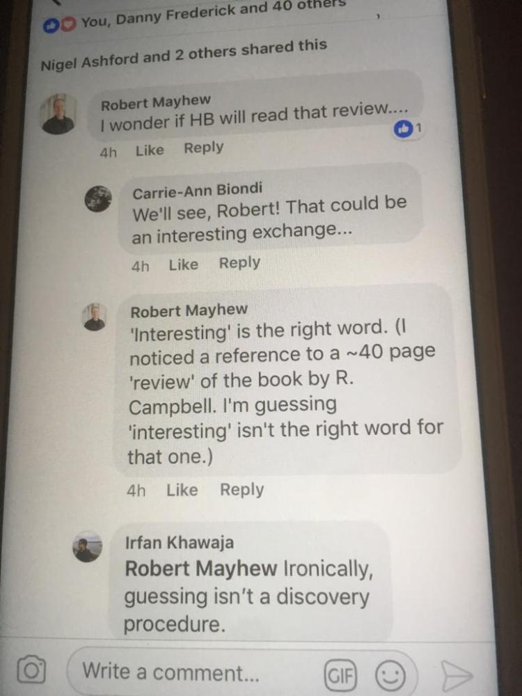 Here’s a Facebook thread, featuring arch-Objectivist Robert Mayhew (Philosophy, Seton Hall University, and Board of Directors, Anthem Foundation), discussing a newly-published review in Reason Papers, by Ray Raad, of Harry Binswanger’s book, How We Know: Epistemology on an Objectivist Foundation. In the last of his comments, Mayhew refers to Robert Campbell’s review (sarcastically dubbed a “review”) of Binswanger’s book in the Journal of Ayn Rand Studies.