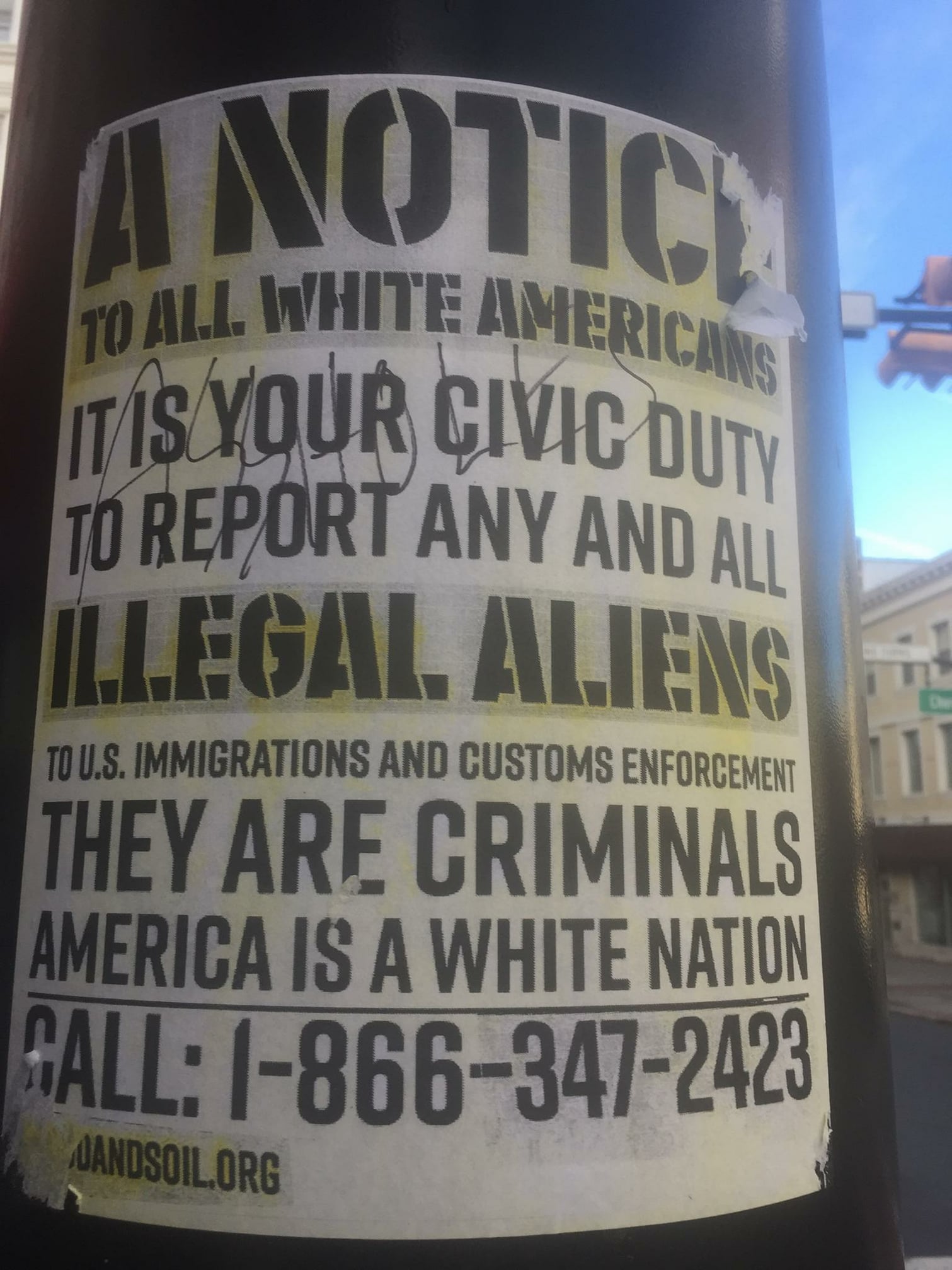 Don’t just leave it up and take a picture of it, and don’t bother calling the police to investigate. No one has a right to put a sign of any kind on a telephone pole without authorization of the owner, much less a sign of this kind. You’re not violating anyone’s rights by taking it down. If you have a genuine “civic duty” as an American, it’s to express your rejection of the politics of “Blut und Boden“–Blood, Soil, and Master Race–before it takes hold more powerfully than it already has. Continue reading